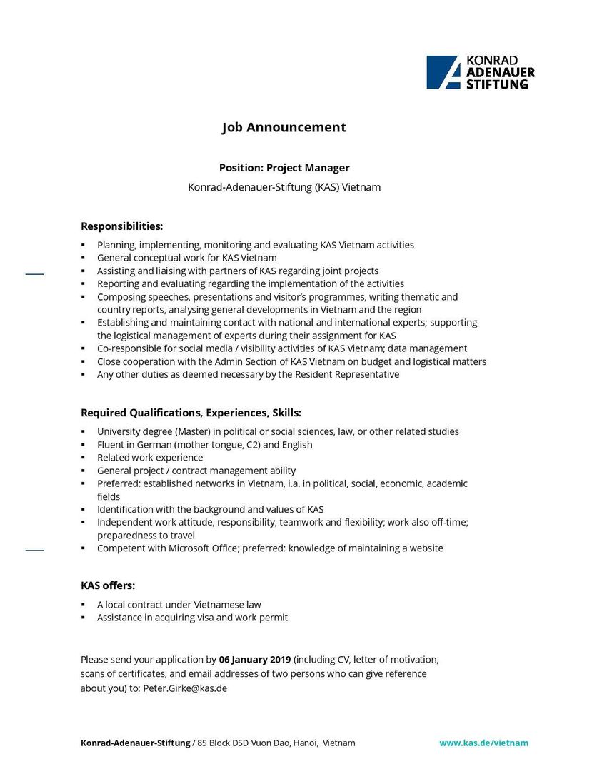 Viện KAS (Đức) tìm kiếm ứng cử viên cho vị trí Quản lý dự án (Project Manager) có bằng cử nhân (hoặc thạc sĩ) ngành chính trị, khoa học xã hội hoặc tương đương.